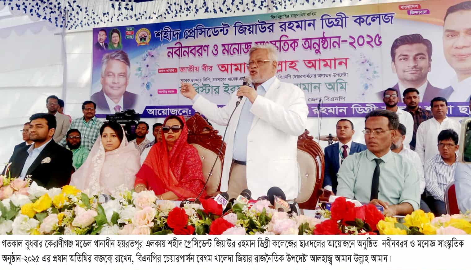 আজ বুধবার কেরাণীগঞ্জ মডেল থানাধীন হয়রতপুর এলকায় শহীদ প্রেসিডেন্ট জিয়াউর রহমান ডিগ্রী কলেজের ছাত্রদলের আয়োজনে অনুষ্ঠিত নবীনবরণ ও মনোজ্ঞ সাংস্কৃতিক অনুষ্ঠান-২০২৫ এর প্রধান অতিথির বক্তব্যে তিনি এইসব কথা বলেন। তিনি আরও বলেন আজ ব্যালট পেপারে নেই আওয়ামীলীগের নৌকা মার্কা। আগামীতে আওয়ামীলীগের মার্কা থাকবে কিনা সেটাও সন্দেহ জনক। নবিনবরণ অনুষ্ঠানে উপস্থিত শিক্ষার্থীদের উদ্দেশ্যে বলেন তোমরা বাসায় গিয়ে তোমাদের পিতা মাতাকে বলবে, আমান আংকেল আপনাদের সালাম দিয়েছে এবং বলেছে অতিতেও আপনারা ধানের শীর্ষে ভোট দিয়েছেন, এবারও ভোট দেওয়ার আহবান জানিয়েছেন। তিনি আরও বলেছেন কেরাণীগঞ্জে উন্নয়ন অব্যাহত থাকবে। তোমরা পিকনিকেও যাবে ।
